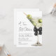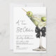 The layout features a clean white background with a nearly black watercolor martini glass and olives on the right side, keeping the design fresh and grown-up. Party details are displayed in crisp, nearly black serif and script fonts for a polished, minimalist look.
