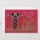 Une invitation rouge et beige avec une ligne pulpeuse et un emblème de Caduceus. Parfait pour obtenir un diplôme d'études de sciences infirmières, un diplôme d'études de médecine, etc. Bien adapté aussi comme invitation à la retraite.La carte est facile à customiser avec votre libellé, police, couleur de police et choix de six types de papier.