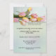 Invitation à un anniversaire de style britannique ou à un brunch de Pâques ou à un thé d'Easter avec un thé coloré sur le devant et des fleurs de tulipes printanières élégantes au dos