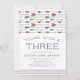 Les invitations adorables pour votre troisième anniversaire sauvage comprennent une bordure de flèches colorées en plumes dans la marine, turquoise et rouge. "Jeune, sauvage et trois" apparaît en lettres bleu marine, avec les détails de votre fête d'anniversaire en dessous.