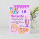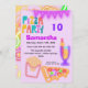 Préparez-vous à une fête d'anniversaire totalement déjantée pour les 10 ans ! Cette invitation électrisante de 13x18 cm éclate de néons des années 80, avec une pizza amusante, des frites, des boissons et des fanions avec texte personnalisé. Le titre vibrant "PIZZA PARTY" en police rétro crée l'ambiance pour une célébration inoubliable.