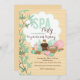 Une image sereine, aux couleurs douces, représentant des branches de bambou et des articles de spa tels que des serviettes, pierre de lave, bougies parfumées, crèmes, parfums, etc. C'est sûr d'attirer vos invités dès qu'ils ouvriront l'enveloppe d'invitation.