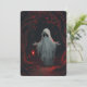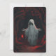 The overall color palette is dark and moody, dominated by blacks, reds, and whites. The illustration employs a detailed, semi-realistic style with a focus on texture and depth, creating a haunting and immersive scene. The ghost's lantern is the only bright source of light, highlighting the eerie, mystical environment.