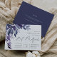 De belles invitations botaniques pour les bat mitzvah présentent des feuilles d'aquarelle et du feuillage dans les tons bleu indigo et violet, en cascade du coin supérieur gauche. Customisez avec vos détails Bat mitzvah alignés à droite et agrémentés de calligraphie chic. Ajoutez des détails supplémentaires, tels que le RSVP, l'itinéraire ou le stationnement, à l'envers.