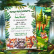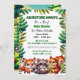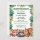 Invitations de douches pour bébé garçon mignonnes avec thème Woodland Creatures avec le raton laveur, l'écureuil et le renard dans un style de dessin animé mignon entouré de bois magiques et de feuillage de fougères.