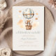 Cette mignonne invitation au baby shower présente un ours en peluche à l'aquarelle douce dans une montgolfière rayée bleue et blanche, au-dessus des mots "L'aventure vous attend !" dans un scénario rétro bleu poussiéreux. Personnalisez le texte avec le nom de la maman-to-be dans le script et les détails dans la police sans serif sur un arrière - plan beige.