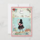 Cartes plates élégantes et fantaisistes pour annoncer votre mariage sur le thème d'Alice au pays des merveilles. Sur le devant de ces jolies invitations shabby chic colorées en bleu et rose, une silhouette d'Alice portant un flamant rose fantaisiste, le chat du Cheshire grimaçant, une théière, une montre de poche dorée élégante, un cœur en forme de tarte à la confiture, et le lapin blanc avec sa montre de poche. Le fond est un beau papier de journal vintage coloré en bleu avec des roses bleues et des marguerites blanches ainsi qu'une clé ancienne. Il y a une jolie bordure rose avec de petits cœurs. Au verso de ces invitations charmantes et amusantes se trouve le même fond avec une jolie bouteille "bois-moi", un cœur en forme de tarte à la confiture, une tasse et une soucoupe. Veuillez noter : tous les produits sur Zazzle ont des images imprimées plates. Tout le texte est entièrement personnalisable pour répondre à vos besoins et vous pouvez changer le style, la couleur et la taille