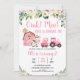 Une petite fille avec des animaux de ferme et un arrangement rose et floral est invitée à la fête d'anniversaire sur le thème de la ferme. Cette conception comporte également une grange rose et un tracteur. Cette invitation sur le thème de la ferme est une façon mignonne de mettre en scène la fête d'anniversaire d'une fille sur le thème de la ferme.