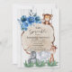 Une tranche de bois rustique avec un spray floral bleu dans le coin, invitation à la baby sprinkle. Il y a des animaux de la jungle assis dans l'herbe au bas de la tranche de bois. Parfait pour le bébé garçon en route. Personnalisez facilement avec les informations de votre fête.