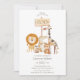 Cette invitation personnalisée présente un thème de zoo pour une fête d'anniversaire. Une image de divers animaux de zoo bébé est représentée debout près d'un panneau en bois. Parmi les animaux, il y a un bébé lion, un lémurien, un crocodile, un bébé tigre, et une girafe.