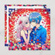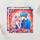 Invitations de mariage personnalisées avec un thème anime. Un garçon et une fille qui bouillonnent entouré de fleurs colorées. Un mignon couple anime, une fille aux cheveux roses et un garçon aux cheveux bleus. Les couleurs sont rouge, bleu, blanc, rose et violet.