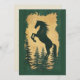 Élégante invitation Année du Cheval 2026 présentant une majestueuse silhouette de cheval cabré en or scintillant sur des pins de couleur vert forêt profond.