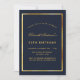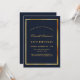 Un arrière - plan bleu foncé, un décoré d'un faux cadre doré. Personnalisez et ajoutez un nom et des détails du parti. Le nom est écrit avec un élégant script de style écrit à la main. Retour : arrière - plan bleu.