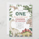 Brown Green Foliage Dinosaur Invitation Anniversaire Dino-mite time tout âge Dinosaur invitation anniversaire dinosaure en vert et marron avec cinq dinosaures.