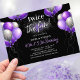 Invitations d'anniversaire conjointe violet & argent avec un arrière - plan noir élégant, des ballons de fête glittery et un modèle texte "deux fois plus amusant" qui est facile à personnaliser.