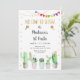 Cette invitation amusante présente des succulents aquarelle avec des accents de parties scintillant dorée et des drapeaux de fiesta couleur.