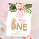 Cette invitation estivale de premier anniversaire a de belles fleurs tropicales d'aquarelle avec des confettis de parties scintillant en faux or et un faux ananas en parties scintillant d'or.