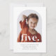 Une simple invitation 5ème anniversaire avec votre propre photo en forme d'arc et les mots 'cinq.' sur le dessus.
