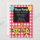 Pizzas à la main mignonnes dansant avec ballons, nappe à plat rouge et blanc invitations à la fête d'anniversaire pour enfants, ados ou adultes !