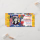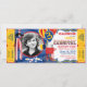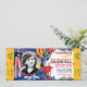 Jonglerie de marcheur d'échasse et cabine de sucrerie de coton avec le cirque de ballons ou carte d'invitation d'anniversaire de thème de carnaval avec des billets d'insertion et de tombola de photo sur le côté. Perforez juste les côtés pour un facile arrachent ! Les couleurs sont des bleus, jaune, rouge, et blanc.