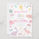 Cette adorable invitation à l'anniversaire présente des dinosaures dessinés à la main, des arcs-en-ciel et des feuilles aux couleurs pastel.