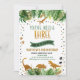 Cette adorable invitation à l'anniversaire présente des feuilles d'aquarelle tropicale aux faux motifs de feuilles d'or, des silhouettes de dinosaures dorées et des confettis.
