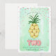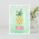 Thème d’anniversaire Luau Deux-Tti Fruitti avec illustration de sculptures d’ananas et de ballons "Deux" avec arrière - plan bleu et confetti rose inspirés de l’aquarelle.