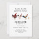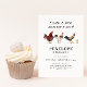 Carte d'invitation pour la fête d'anniversaire du thème de la ferme mignonne avec l'aquarelle illustrant les poulets et un poussin. Le texte dit "Cluck, accroche ! Rejoignez le troupeau !"