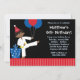 Une jolie invitation à l'anniversaire sur le thème des arts martiaux pour les garçons. Avec une illustration de garçon afro-américain portant une ceinture jaune. Dans les tons bleus, rouges et noirs. Idéal pour une fête d'anniversaire de Taekwondo ou de Karate. customisez facilement avec vos informations de fête.