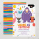 Invitez les amis de votre petit à une fête d'anniversaire pleine de plaisir, de mystère et de douceur mythique ! Cette charmante invitation présente des cryptides sympathiques de style cartoon, tels que Bigfoot, l'Homme-Mouche, Nessie, l'Abominable Homme des Neiges, le Diable du New Jersey et Chupacabra, tous souriants et prêts à célébrer.