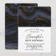 Une invitation d'anniversaire avec une belle image de pierre d'agate abstraite sombre. Les couleurs tourbillonnent en vagues. Les couleurs principales sont le noir, le gris-bleu avec un ruban doré factice qui traverse le design. Moderne et tendance.