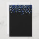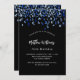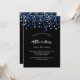 Une invitation moderne, élégante et raffinée. Un arrière - plan noir décoré de confettis bleus. Personnalisez et ajoutez un nom et des détails. Texte blanc.