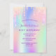 Une invitation à la fête d'anniversaire de 21e anniversaire, féminine et féminine (ou tout âge). Devant : Un arrière - plan de couleur holographique en violet, rose, vert menthe. Décoré avec des gouttes d'or violet, rose et faux. Personnalisez et ajoutez un nom et des détails du parti. Le nom est écrit avec un script de style écrit à la main, des lettres de couleur violette. Retour : couleurs arc-en-ciel et gouttes. Une invitation virtuelle correspondante est disponible dans notre magasin.