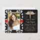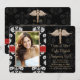 Ajoutez votre photo ou votre photo préférée à ces annonces de graduation d'une école d'optométrie en noir et blanc, élégantes et formelles, ainsi qu'à des invitations avec un caducée de serpent d'or et un motif imprimé de ruban cousu rouge pour le dentiste diplômé. Customisez-le de dire ce que vous voulez sur le dos et devant de ces invitations à la graduation optométriste avec les initiales D.O. sur le dos. Oeuvre © Chrissy H. Studios, LLC. Tous droits réservés.
