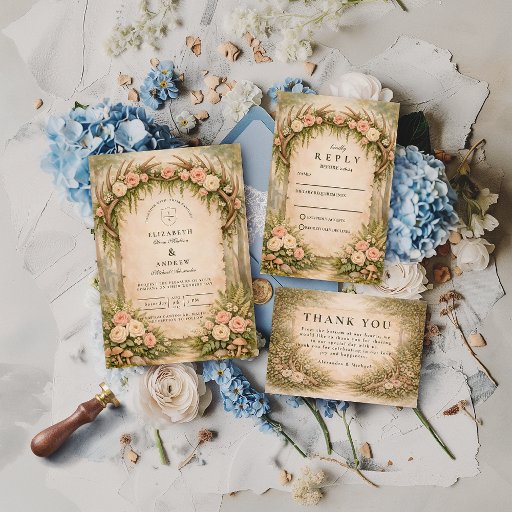 A romantic woodland-inspired design featuring soft neutral florals, elegant antlers, and a warm vintage parchment background. The composition blends organic greenery with refined details for a timeless boho aesthetic that feels both intimate and elevated. Perfect for couples drawn to nature, understated luxury, and classic romance with a rustic touch.