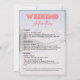 Personalize the text to include your weekend destination, travel dates, and contact details. Add the optional back side itinerary to include travel arrangements, lodging contributions, and planned group activities like snowmobiling, dogsledding, spa time, or brunch.