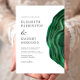 Cet élégant faire-part de mariage moderne dispose d'une aquarelle vert émeraude géode avec des reflets de feuille sur un arrière - plan blanc. Customisez le texte gris charbon aligné sur la marge gauche avec les noms de la mariée et du marié et les détails du mariage. L'envers est une nuance assortie de vert émeraude solide.