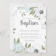 Une belle invitation florale Baptême convenant à un petit garçon ou une petite fille. Ce design présente un cadre environnant d'anémones blancs aquarelles, de feuilles verts et de fines fleurs bleues. Le mot "Baptême" est en couleur gris foncé, en caractères de style moderne, et les détails de votre événement sont en caractères sans serif modernes. L'inverse est en bleu clair solide avec des rayures blanches verticales.