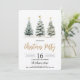 Invitation vos invités à une célébration mémorable avec cette élégante invitation de Noël aquarelle avec trois pins magnifiquement illustrés surmontés d'étoiles dorées. La délicate typographie dorée apporte une touche de sophistication festive, tandis que les détails personnalisables vous permettent de personnaliser vos informations événementielles sans effort. Parfait pour des réunions familiales, des fêtes de bureau ou des soirées de vacances, cette carte donne le ton d'une occasion festive et élégante. Customisez-le pour en faire le vôtre et diffusez la joie des fêtes !