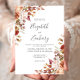 Cette élégante faire-part de mariage moderne présente des arrangements floraux de chute d'aquarelle et feuillage d'automne dans des tons de terre douce dans deux coins sur un arrière - plan blanc. Le texte personnalisable combine l'écriture fantaisiste grise, les polices cuivre et italique. L'envers est blanc solide.