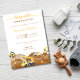 Une invitation au baby shower aquarelle dans les tons chauds jaune et marron, créant une atmosphère cosy et rustique avec un thème "bébé en construction". Le jaune doux forme la couleur principale, accentuée par des éléments bruns riches pour une ambiance naturelle. La conception comprend des illustrations aquarelle d'objets de construction, comme de minuscules outils, des blocs de bois et un petit bétail, placés au bas de la carte plutôt que dans l'arrière - plan. Ces illustrations se trouvent à la base, ajoutant une touche ludique tout en permettant au texte de se démarquer. La typographie est amusante mais élégante, ce qui rend l'invitation parfaite pour une fête de baby shower mémorable.