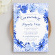 Elégante invitation à la Quinceanera bleue royale avec une couronne d'aquarelle fleurie et des bords de parties scintillant faux. Cet invitation formel est un parfait mélange de traditionnel et de moderne. Personnalisez facilement en utilisant les champs de modèle en ligne. Le libellé peut être changé en espagnol.