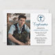 Feuilles d'aquarelle monochromatique bleu en bleu le haut de cette photo design avec la croix bleue et le mot "Confirmation" dans le texte de script inédite. Ajoutez simplement la photo, le nom et la cérémonie de confirmation et les détails de la célébration de votre enfant. Le dos est doté d'un arrière - plan bleu dégradé d'aquarelle. Conception composite par Holiday Hearts Designs (droits réservés). Photo de l'espace réservé modèle avec l'aimable autorisation de Unsplash.