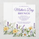 Une belle invitation à Brunch de la Fête des Mères thème printemps pour elle. L'arrière - plan présente des fleurs d'aquarelle mélangées et de la verdure sur le blanc. Les couleurs principales sont le blanc, le vert, le violet et le jaune doré. La couleur de police est définie pour correspondre à la lavande violette.