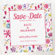 Une aquarelle moderne peinte de fleurs et de feuilles aux couleurs riches et parsemée sur un arrière - plan blanc. Une magnifique coordination Save the Date invitation que vous pouvez modifier pour convenir à votre propre célébration. Art original de Nic Squirrell.