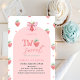 Une mignonne invitation au baby shower comporte une fraise aquarelle et un arc. Ces invitations d'anniversaire sont facilement customisées pour votre événement en ajoutant simplement vos détails.
