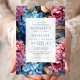 Un élégant design floral avec des hydrangées luxuriantes dans les tons rose et bleu fournit l'arrière - plan pour le texte gris fusain sur un écran rectangulaire blanc. Le design floral est répété sur le dos de la carte.