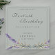 Une belle invitation d'anniversaire moderne et élégante pour adultes conçue avec des fleurs de lavande aquarelle peintes à la main. Personnalisable pour n'importe quel jalon d'anniversaire. Sage green invitation avec script argent