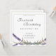 Une belle invitation d'anniversaire moderne et élégante pour adultes conçue avec des fleurs de lavande aquarelle peintes à la main. Personnalisable pour n'importe quel jalon d'anniversaire. Script au charbon de bois avec bordure sage