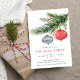 Invités Invitations à votre fête de vacances en style avec nos élégantes invitations à Noël de la branche de pin aquarelle. Les invitations de fête festive présentent une branche de pin vert et des baies sèches avec des ornements de Noël bleu, or et rouge aquarelle. Personnalisez les invitations de fêtes en ajoutant les détails de votre fête ci-dessous. L'invitation revient à une couleur arrière - plan vert foncé et solide.